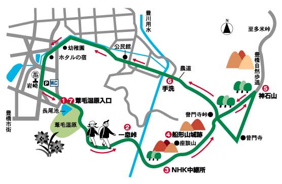 ◇コースのあらまし “東海の尾瀬”と称される湿地帯『葦毛湿原』を通り、一等三角点のある神石山の山頂を目指します。 山頂へ向かう尾根道からは三河湾、豊橋市街、遠州灘等の展望が楽しめます。 ◇アドバイス 船形山城跡から神石山へ向かう途中、右手に『普門寺』への道標に出会います。 時間に余裕があれば立ち寄ってください。 桜や紅葉のシーズンはとくにおすすめです。 ただし、急な下り道ですから体力に応じて判断してください。 また神石山からの下山の際も急勾配になっている部分がありますので十分気をつけてください。 | |||