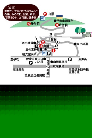 ◇アドバイス 真夏の登山道は日を避けるところがないので、早朝または夜間登山をおすすめします。 ご来光を拝むための夜間登山は人気がありますが、経験者の付き添いが必要でしょう。 今回紹介したコースよりも気軽に伊吹山を楽しみたい方は、登山口からゴンドラで3合目まで行き、 そこからは約2時間歩行、という方法もあります。 また、伊吹山ドライブウェイ利用で一気に山頂駐車場まで行き、遊歩道を歩くこともできます。 西廻り遊歩道コース(山頂まで約40分)、中央遊歩道コース(山頂まで約20分)、 東廻り遊歩道コース(下り専用山頂から約60分)。 戻る | ||||