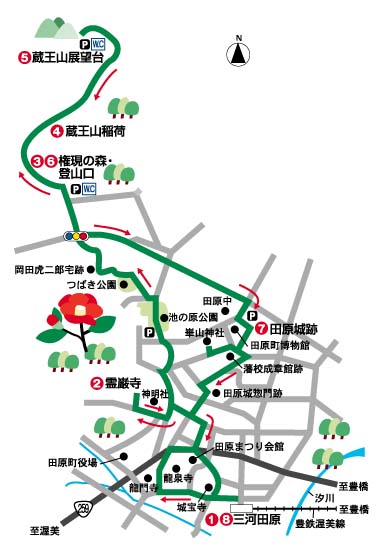 ◇コースのあらまし 田原町は渥美半島への玄関口。 江戸時代後期に活躍した先覚者「渡辺華山」ゆかりの地でもあります。 史跡を巡り歴史を堪能しながら蔵王山の山頂を目指し、山頂展望台からの三河湾、知多半島、渥美半島、太平洋の大パノラマを楽しみます。 ◇アドバイス 体力や時間に余裕がない人は“蔵王山ハイク”だけでもおすすめします。 往復1時間程度で適度な運動が楽しめ、しかも絶景を拝むことができる山はなかなかありませんよね。 又、蔵王山山頂付近はドライブウェイを横断することになりますので、往来の自動車やバイクにはご注意ください。 戻る | ||||