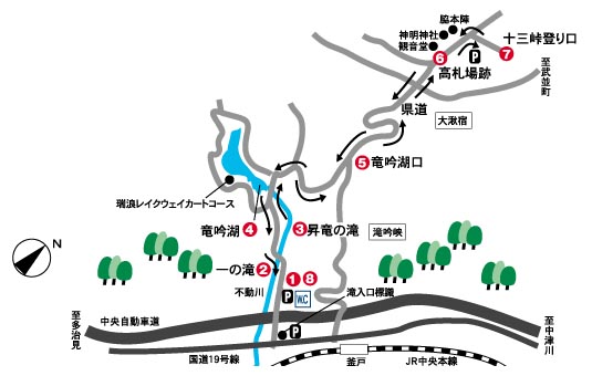 ![]() ![]() 1.竜吟峡駐車場 --(3分)→ 2.一の滝 → 二の滝 → 三の滝 → えびす滝 → あんま滝 --(15分)→ 3.昇竜の滝 → 汎天の滝 --(20分)→ 4.竜吟湖 --(15分)→ 5.竜吟湖口・県道 --(25分)→ 6.高札場跡 → 観音堂 → 神明神社 → 脇本陣 --(10分)→ 7.十三峠登り口 --(80分)→ 8.竜吟峡駐車場 ■距離 約7km |