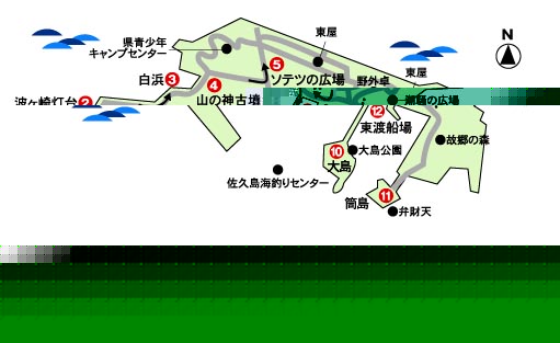 ![]() ![]() 1.西渡船場 --(5分)→ 2.波ヶ崎灯台 --(15分)→ 3.白浜 --(5分)→ 4.山の神古墳 --(15分)→ 5.ソテツの広場東屋 --(20分)→ 6.日だまりの広場 -→ 7.東屋 --(20分)→ 8.八剣神社 --(10分)→ 9.大浦海水浴場 --(15分)→ 10.大島 --(55分)→ 11.筒島 --(40分)→ 12.東渡船場 ■距離 約9.7km |