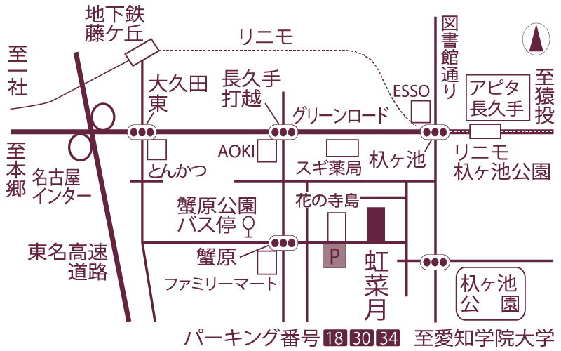 名古屋ICより、60号線(グリーンロード)を猿投方面へ。「長久手打越」を右折し、一つ目の信号を左折してすぐ)約10分)