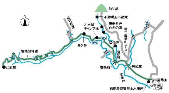 ![]() ![]() 石水渓口バス停 --(45分)→ 石水渓キャンプ場 --(15分)→ 三ッ淵・白糸の滝 --(20分)→ 石水渓キャンプ場 --(70分)→ 安楽越 --(90分)→ 石水渓口バス停 ■距離12km ■標高差安楽越494m |