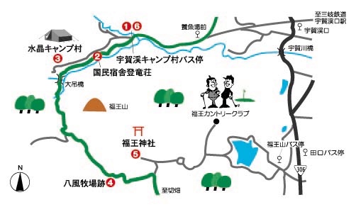 ![]() ![]() 1.宇賀渓キャンプ村バス停 --(10分・858歩)→ 2.国民宿舎登竜荘 --(10分・877歩)→ 3.水晶キャンプ場 --(60分・5152歩)→ 4.八風牧場跡 -→ 5.福王神社 -→ 往路を戻る--(90分・7083歩)→ 6.宇賀渓キャンプ村バス停 ■距離 9.4km |