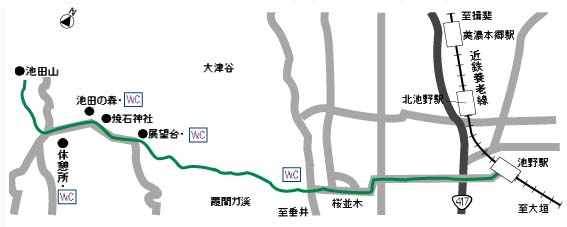 ◇アドバイス 特に霞間ガ渓から展望台の間は急な登り道が続きますので、定期的に休憩をとりましょう。 また展望台から山頂の間は、自動車道を横断するところが何度かありますので走行車には 十分気をつけてください。おすすめランチスポットは、展望台と池田の森です。 | |||