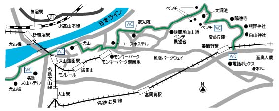 ![]() ![]() 善師野駅 --(15分)→ 熊野神社 --(15分)→ 大洞池 --(40分)→ 継鹿尾山山頂 --(20分)→ 寂光院 --(45分)→ 犬山城 --(10分)→有楽苑--(10分)→犬山遊園駅 |