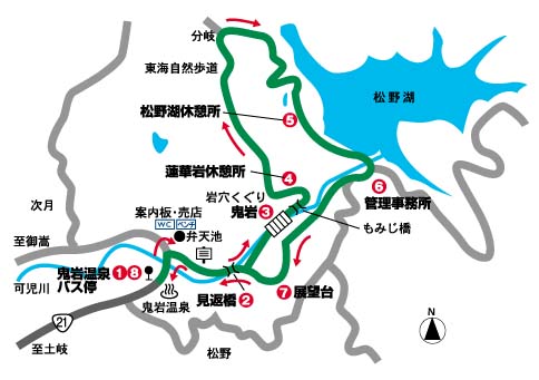 ![]() ![]() 1.鬼岩温泉バス停 --(10分)→ 2.見返橋 --(5分)→ 3.鬼岩・鬼の岩屋くぐり --(15分)→ 4.蓮華岩展望台 --(10分)→ 5.松野湖 --(15分)→ 6.管理事務所 --(20分)→ 7.展望台 --(20分)→ 8.鬼岩温泉バス停 ■歩行距離 3.5km ■歩行歩数 5,588歩 ■消費カロリー 91.1kal |