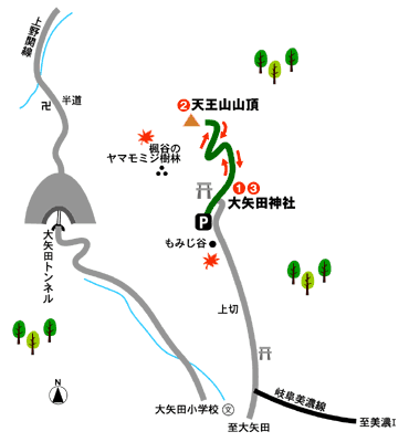 ◇コースのあらまし 楓谷のヤマモミジ樹林で知られる大矢田神社を起点とした気軽な低登山。 紅葉の季節だけでなく一年中楽しめるコースです。 道は歩きやすく、急な登りもないのでファミリーでもOK。 特に山頂は広々としており、美濃の山々に囲まれた展望も最高です。 ◇アドバイス 低山といえどもやはり登山ですから、しかっりとしたシューズを履いていくのがベター。 又、この季節のハイキングは体温を保つことが大切です。 脱ぎ着が簡単な服を重ね着して、体温調節を速やかにできるようにしておきましょう。 戻る | ||||