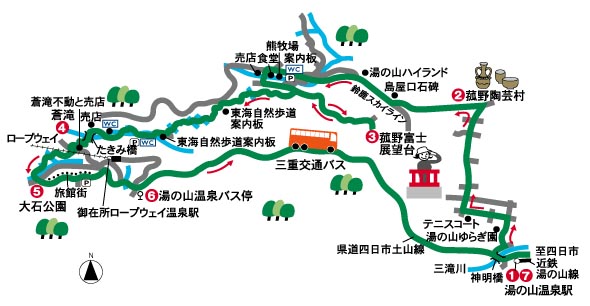 ![]() ![]() 1.湯の山温泉駅 --(35分・2679歩)→ 2.陶芸村 --(45分・3768歩)→ 3.菰野富士展望台 --(60分・4444歩)→ 4.蒼滝 --(25分・1455歩)→ 5.大石公園 --(15分・1482歩)→ 6.湯の山温泉バス停 -→ 三重交通バス --(10分)→ 7.湯の山温泉駅 ■標高差 菰野富士山頂 369m |